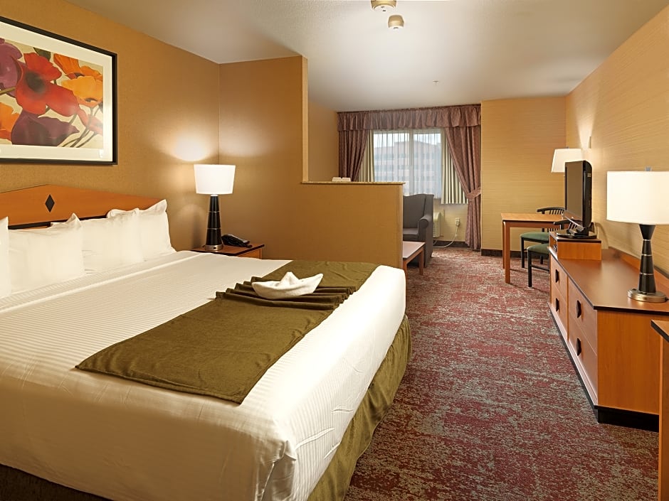 • Free Hot Buffet Breakfast served each morning • Complimentary WiFi throughout the hotel • 32-inch flat screen TV with DirecTV and HBO • Seating area includes sofa sleeper • iPod docking station • Microwave • Mini-fridge • Coffee Maker • Hair Dryer • Iron and ironing board • Bath and Body Works shampoo and soap Amenities Alarm Clock Bathroom Telephone Coffeemaker Iron Ironing Board Microwave Personal Refrigerator Sofa Bed T